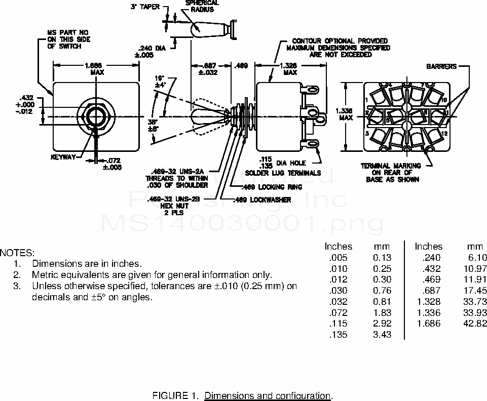 MS14003 Switch, Toggle, Positive Break, Environmentally Sealed, Solder Lug, Four Pole, .469 Mounting Bushing, 25 Amperes