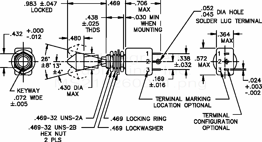 MS21026 Switch, Toggle, Positive Break, Lever Lock, Miniature Toggle Sealed, Solder Lug, Single Pole, .469 Mounting Bushing