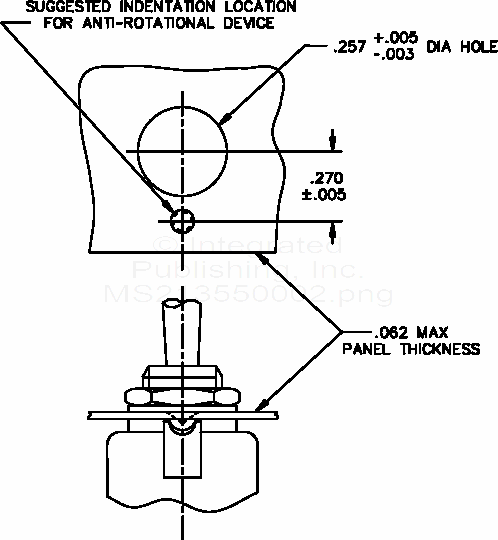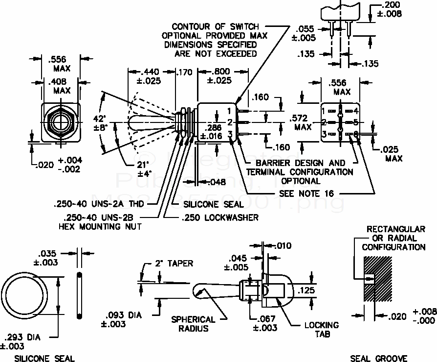 MS21355 Switch, Toggle, Positive Break, Miniature, Toggle Sealed, Printed Circuit Board Terminals, Double Pole, .250 Mounting Bushing