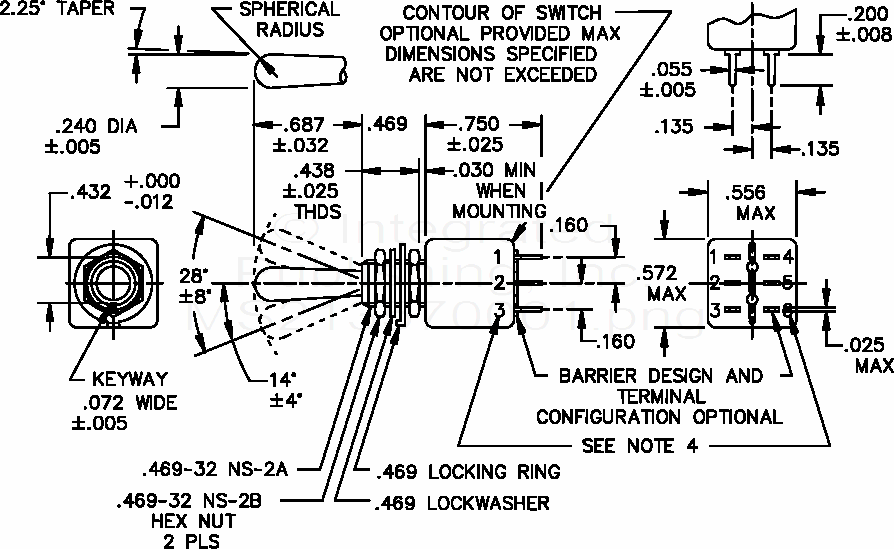 MS21357 Switch, Toggle, Positive Break, Miniature, Toggle Sealed, Printed Circuit Board Terminals, Double Pole, .469 Mounting Bushing