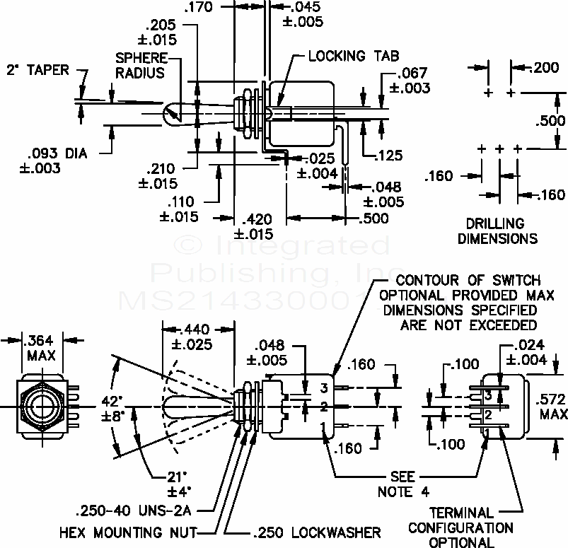 MS21433 Switch, Toggle, Positive Break, Miniature, Toggle Sealed, Single Pole, Printed Circuit Board Terminals, Right Angle Mount