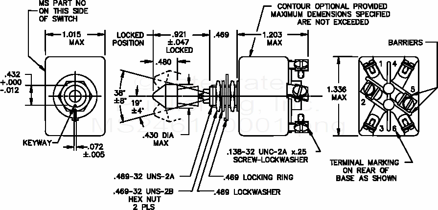 MS24613 Switch, Toggle, Positive Break, Lever Lock, Environmentally Sealed, Screw Terminal, Double Pole, .469 Mounting Bushing, 25 Amperes
