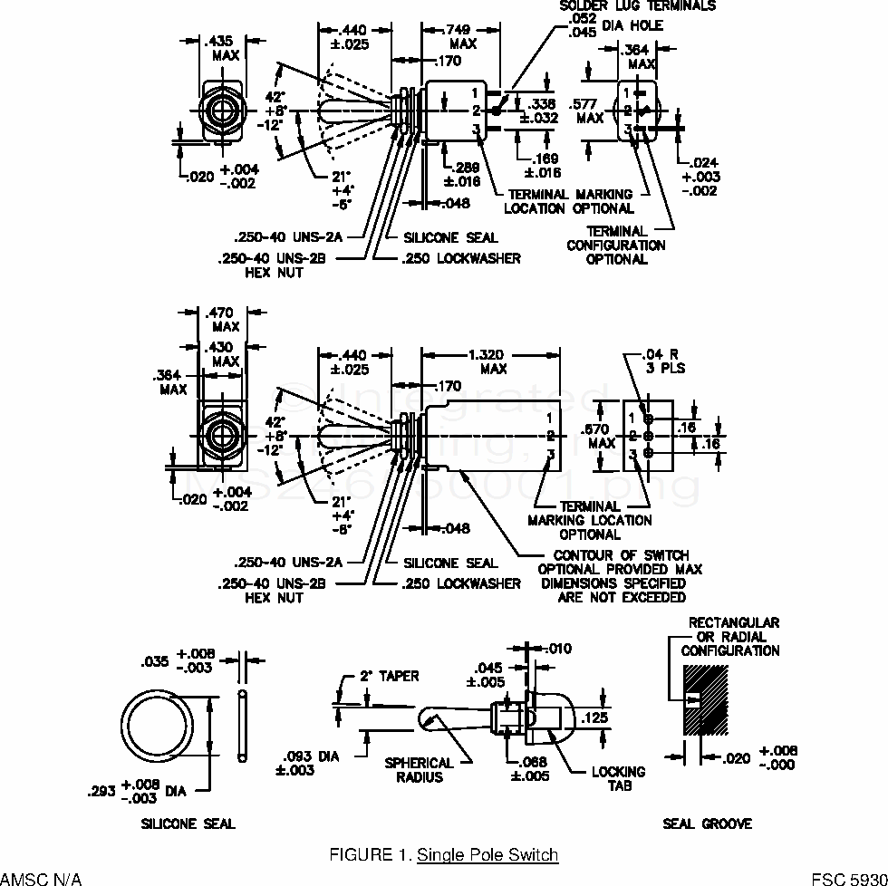 MS24655 Switch, Toggle, Positive Break, Miniature Toggled Sealed, Single Pole, Solder Lug Or Integrated Wire Terminals: .250 Mounting Bushings