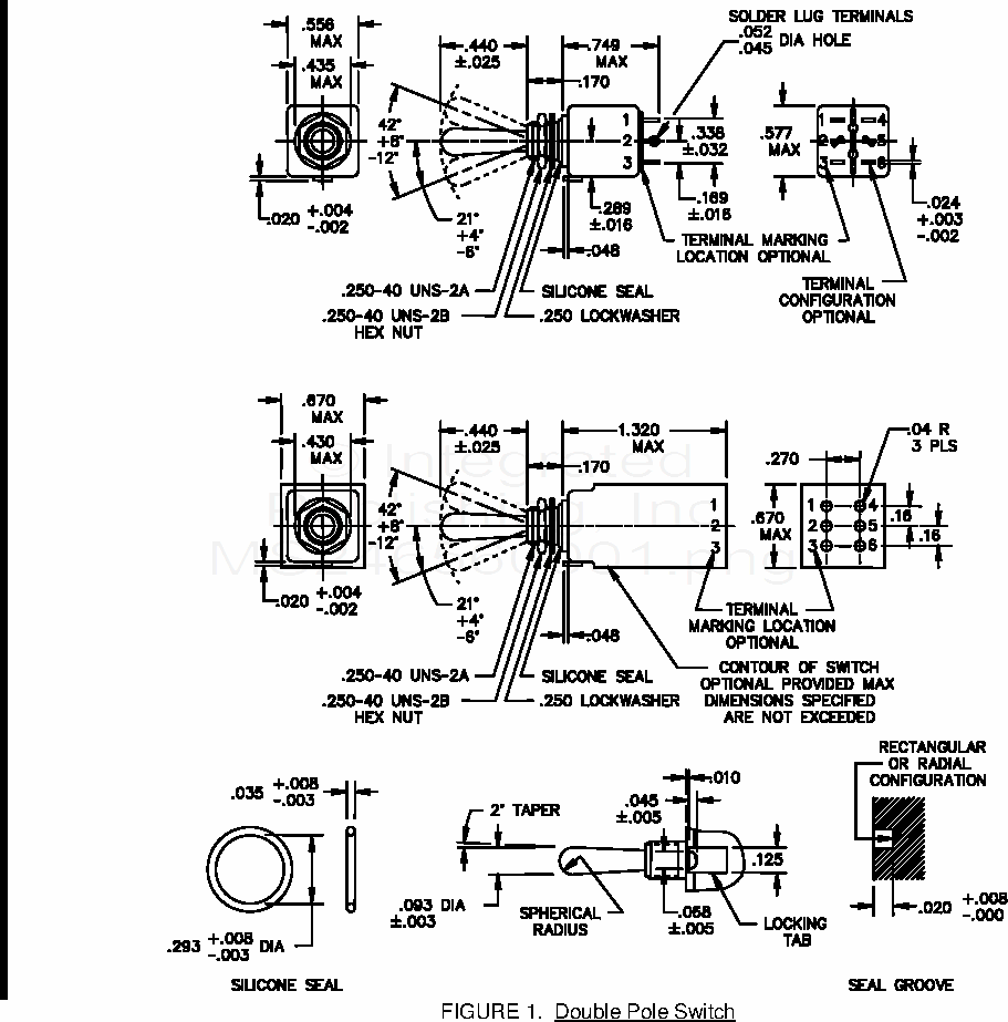 MS24656 Switch, Toggle, Positive Break, Miniature Toggled Sealed, Double Pole, Solder Lug, Or Integrated Wire Terminals: .250 Mounting Bushings