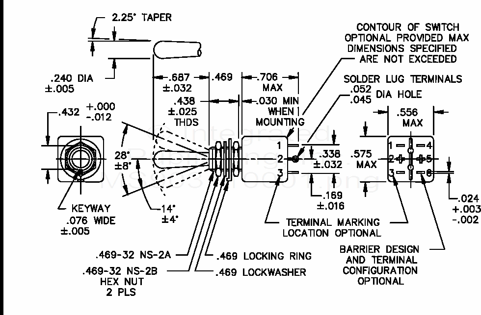 MS90311 Switch, Toggle, Positive Break, Miniature Toggle Sealed, Solder Lug, Double Pole, .469 Mounting Bushing